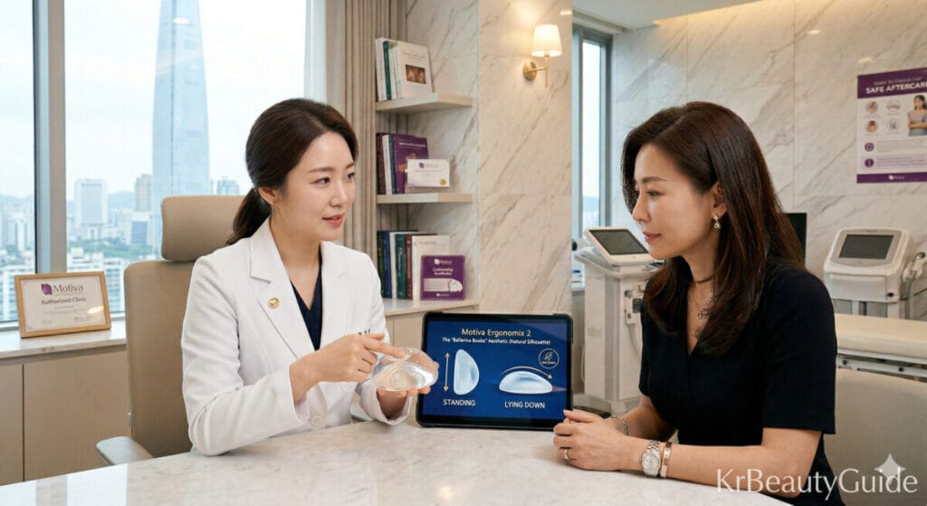 - Elite Surgeon Matching: Korea Beauty Guide ensures patients are matched exclusively with elite, female, English-speaking, board-certified surgeons who specialize in the Motiva Ergonomix 2 Gangnam procedures and the “No-Drain” technique.